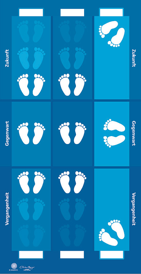 Unser Wahrnehmungsteppich (siehe Abbildung) ist eine Eigenentwicklung unseres Instituts. Sein Vorzug liegt darin, dass er alle Positionen und alle Zeiten abbildet und sowohl von einer wie von mehreren Personen gleichzeitig genutzt werden kann. Damit ist er auch für fortgeschrittene NLP-Anwendungen nützlich, etwa für die Kombination der Wahrnehmungspositionen mit einem Timeline-Coaching (Seite 220 im Buch) oder einer Aufstellungsarbeit. Im Seminar liegt er wie ein großer Teppich zu Füßen der Teilnehmer, die darauf auf ihre Erkundungstour gehen, während der prozessbegleitende Coach von außerhalb seine Instruktionen gibt und Fragen stellt. Damit wirkt der Teppich wie ein » Bodenanker (siehe Seite 79 im Buch) der die Assoziation erleichtert und das Erleben intensiviert.
