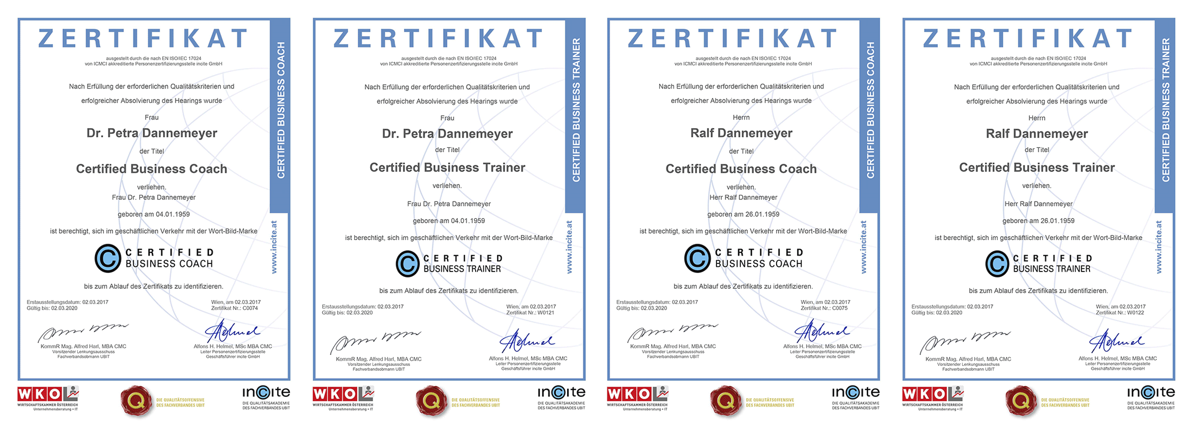 Dr. Petra Dannemeyer und Ralf Dannemeyer sind jetzt „Certified Business Trainer“ und „Certified Business Coaches“. Die Zertifizierungen erfolgten auf der Grundlage der Euronorm DIN EN ISO 17024 und entsprechen den internationalen Standards. Die Wirtschaftskammer Österreich bestätigt uns damit nachprüfbare Qualität im Business-Training und -Coaching.
